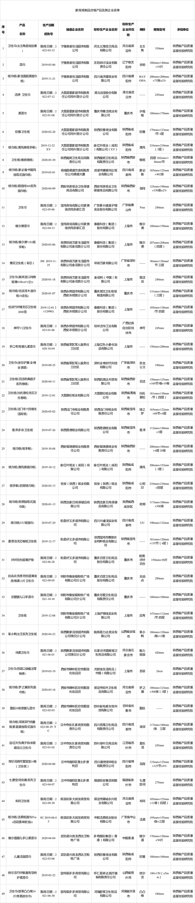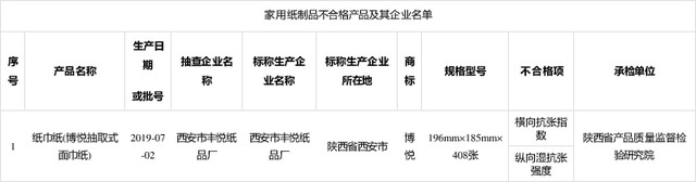 此次家用纸制品产品样品在西安、渭南、宝鸡、咸阳、汉中、商洛、西咸新区等地区的生产及流通领域中抽取,共抽查标称生产企业45家,抽取样品50批次。经检验,合格样品49批次;1批次样品不符合本次监督抽查标准要求,涉及横向抗张指数、纵向湿抗张强度。