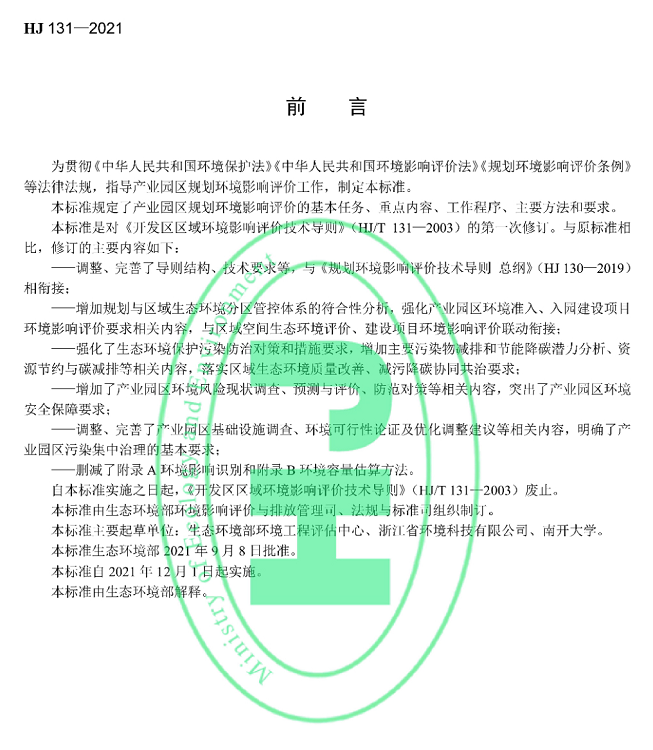 《规划环境影响评价技术导则产业园区》(HJ131-2021)(以下简称《规划环评导则产业园区》)是落实《环境影响评价法》等法律法规,衔接《规划环境影响评价技术导则总纲》(HJ130-2019)和“三线一单”生态环境分区管控要求,推动“放管服”改革,进一步规范和指导产业园区规划环评工作的重要举措。标准自2021年12月1日起实施。